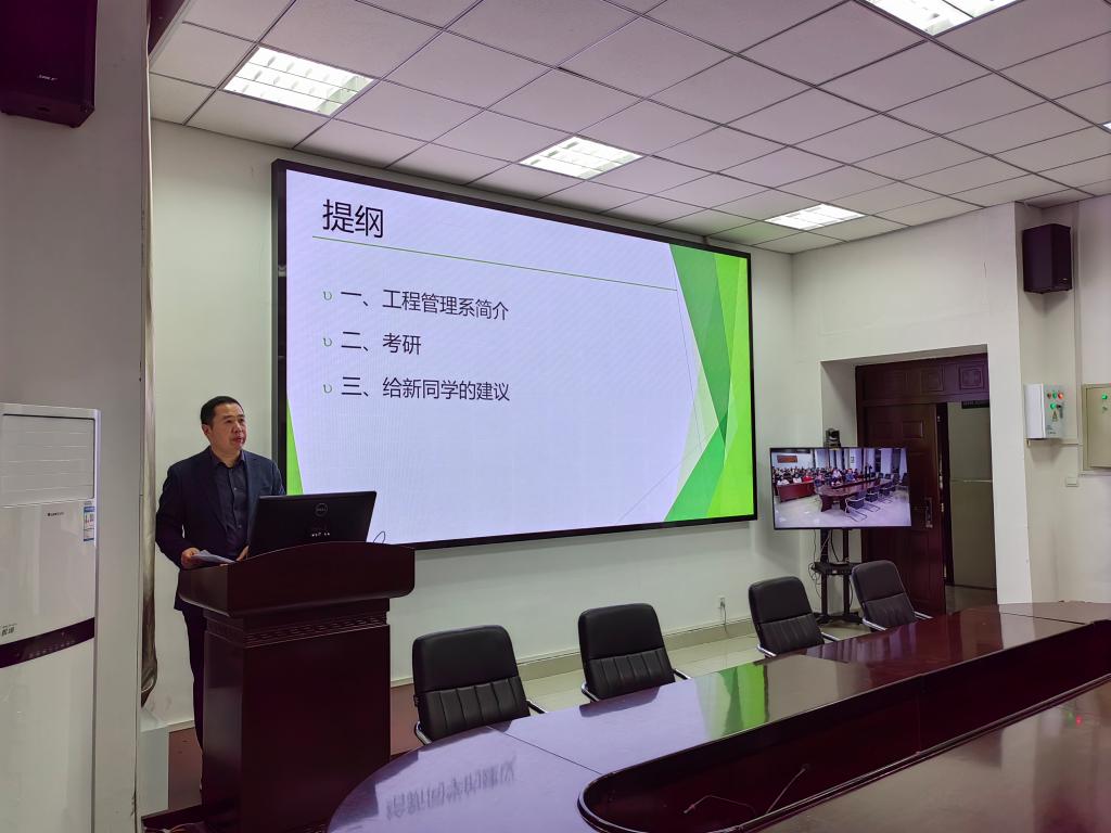 张宗领首先介绍了工程管理系的师资、办公地点、BIM中心,随后介绍了工程管理专业考研的方向、课程、过程及学院为同学们考研提供的服务,最后对新同学提出了建议,要求大家以学业为主,树立目标,合理安排时间,营造良好班风学风,不要沉迷手机游戏。