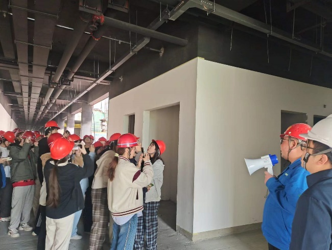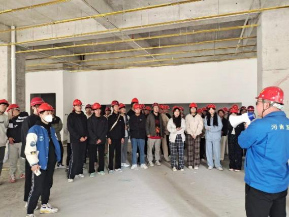 抵达现场后,实验科研综合楼一标段工地负责人,首先,对yl23411永利集团官网工程管理专业师生的到来表示热烈的欢迎,并对实习过程中的安全注意事项做了介绍和要求。随后,现场技术负责人向同学们介绍了实验科研综合楼的工程概况以及目前的施工进度。结合现场的施工情况,详细讲解了室外玻璃幕墙的安装、超过24米脚手架搭设方案的论证、弧形梁的放样以及现场新材料的性能等内容。并带领同学们参观了装修样板间,详细介绍了墙面抹灰工序流程、地面装修的注意事项、天花板龙骨的间距以及卫生间的闭水试验等相关专业知识。