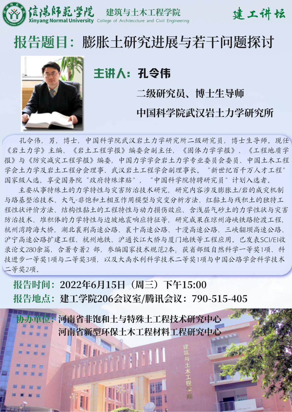报告人简介:孔令伟,男,博士,中国科学院武汉岩土力学研究所二级研究员,博士生导师。现任《岩土力学》主编、《岩土工程学报》编委会副主任,《固体力学学报》、《工程地质学报》与《防灾减灾工程学报》编委,中国力学学会岩土力学专业委员会委员、中国土木工程学会土力学及岩土工程分会理事、武汉岩土工程学会副理事长。“新世纪百千万人才工程”国家级人选,享受国务院“政府特殊津贴”,“中国科学院特聘研究员”计划入选者。主要从事特殊土的力学特性与灾害防治技术研究,研究内容涉及膨胀土/岩的成灾机制与路基整治技术、大气-非饱和土相互作用模型与灾变分析方法、红黏土与残积土的独特工程性状评价方法、结构性黏土的工程特性与动力损伤效应、含浅层气砂土的力学性状与灾害防治技术、堆积体的力学特性与边坡地震响应特征等,研究成果在琼州海峡铁路轮渡工程,杭州湾跨海大桥,湖北襄荆高速公路、襄十高速公路、十漫高速公路、三峡翻坝高速公路、沪宁高速公路扩建工程、杭州地铁、沪通长江大桥与厦门地铁等工程应用。已发表SCI/EI收录论文280余篇,合著专著2 部,参编国家技术规范2本;获省部级自然科学一等奖1项、科技进步一等奖1项与二等奖3项,以及大禹水利科学技术二等奖1项与中国公路学会科学技术二等奖2项。