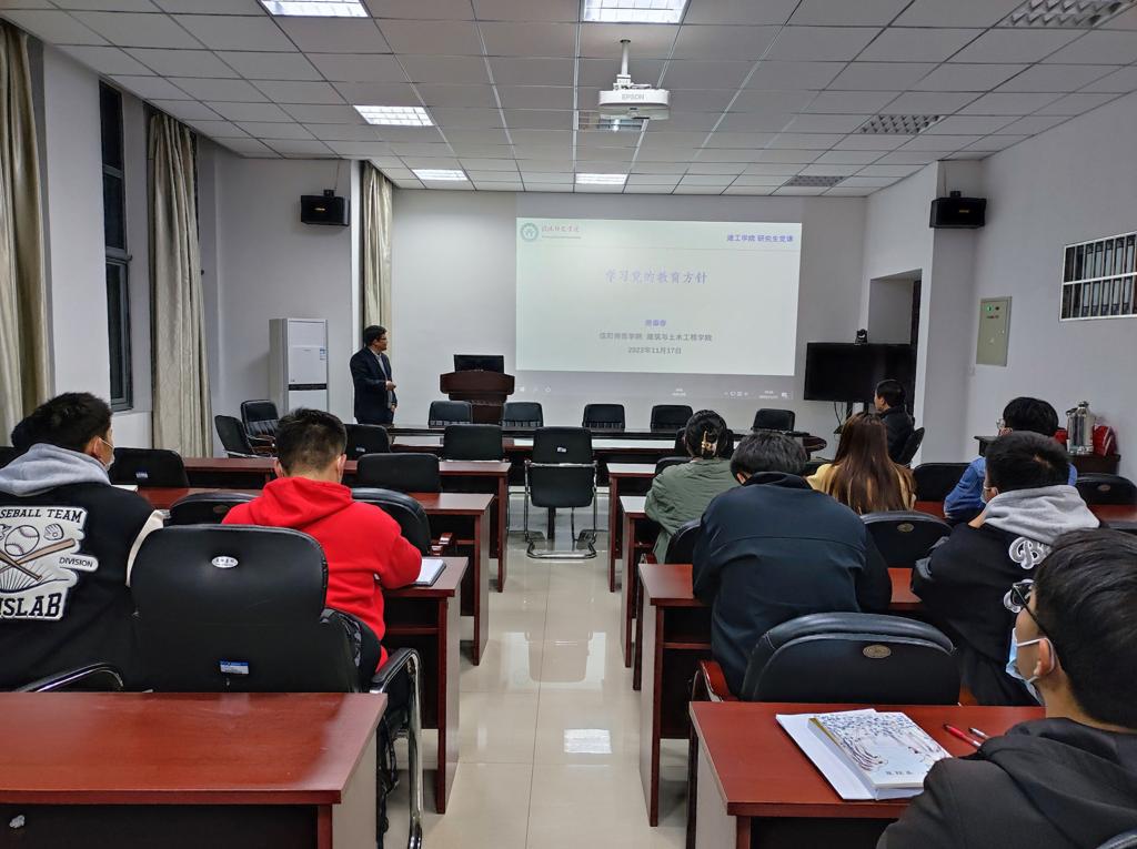 2022年11月17日晚上,yl23411永利集团官网院长、河南省高等学校优秀共产党员周葆春同志在综合实验楼206室为研究生讲思想政治理论课,学习党的教育方针,寄语研究生新生,副院长肖琪聃,研究生班主任马文强和2022级全体研究生参加了本次活动,会议由肖琪聃主持。