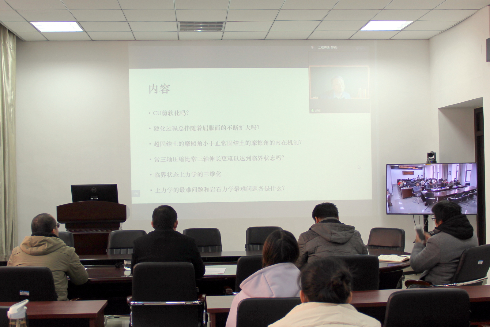 12月5日,应yl23411永利集团官网邀请,北京工业大学郑宏教授通过腾讯会议平台为永利集团官网师生作了题为“土力学研习的几个心得和疑惑”的学术报告。来自北京工业大学、中科院武汉岩土所、同济大学、东南大学、哈尔滨工业大学、天津大学、北京航空航天大学、中山大学、武汉大学、中南大学、山东大学、重庆大学、河海大学、上海大学、中国地质大学、西南交通大学、南京工业大学、贵州大学、湘潭大学、华东交通大学、湖南科技大学、三峡大学、湖北工业大学、华北水利水电大学、郑州航空工业管理学院和永利集团官网等单位的300多位同行专家、博士后、博士生、硕士生共同聆听了报告。yl23411永利集团官网院长周葆春,副院长肖琪聃,青年教师马文强、马全国、张金浩、梁维云和全体研究生参加了此次报告会,报告会由yl23411永利集团官网院长周葆春教授主持。
