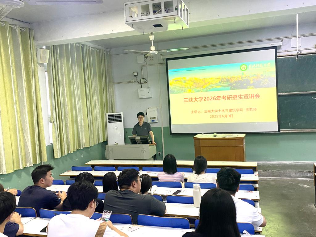 2025年6月9日,三峡大学土木与建筑学院研究生办公室主任徐潇宇来永利集团官网开展研究生招生宣讲活动。本次宣讲会在教2梯5教室举行,重点面向永利集团官网2022级本科生,学院副院长袁晓辉主持活动。
