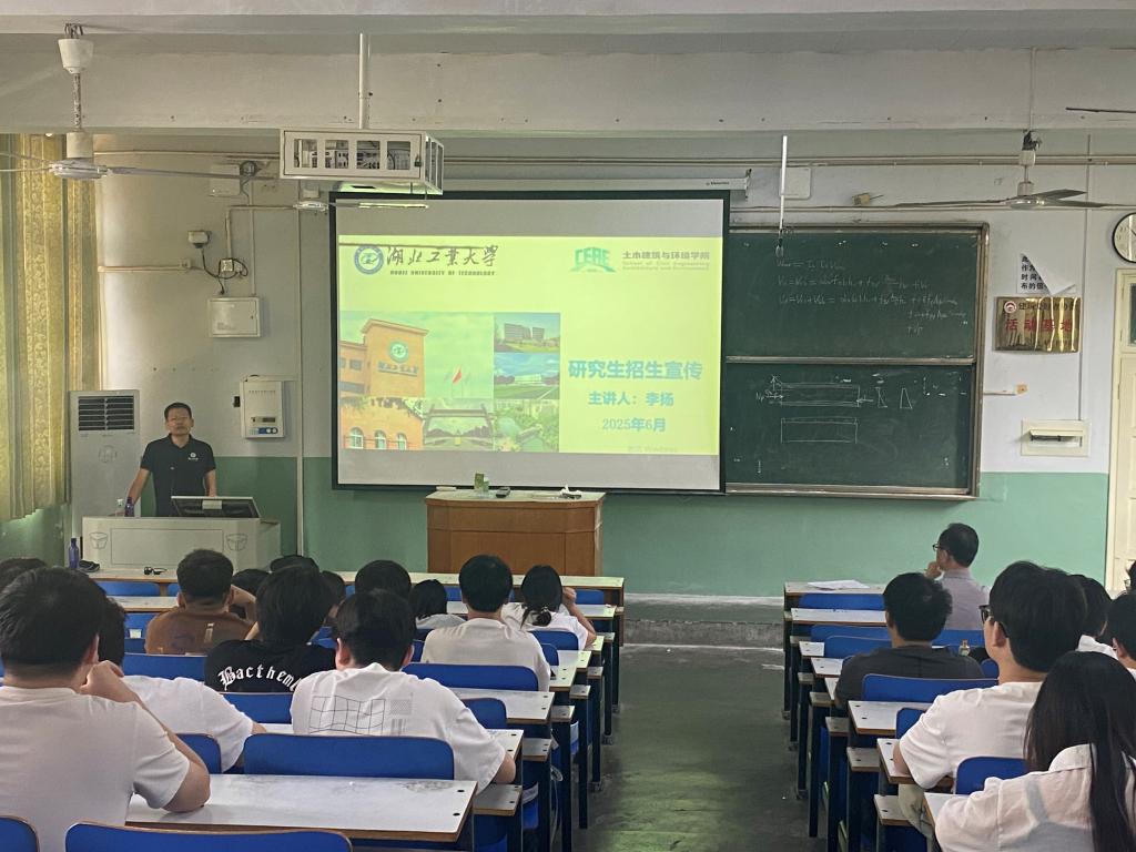 2025年6月10日,湖北工业大学土木建筑与环境学院建筑工程系主任李扬教授来永利集团官网开展研究生招生宣讲活动。本次宣讲会在教2梯5教室举行,重点面向永利集团官网2022级本科生,学院副院长袁晓辉主持活动。