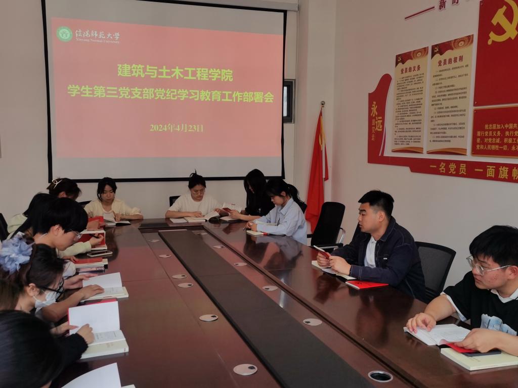 根据建筑与土木学院党委工作安排部署,4月23日上午,yl23411永利集团官网学生第三党支部在学院楼402召开党纪学习教育工作部署会,支部全体党员参加会议。