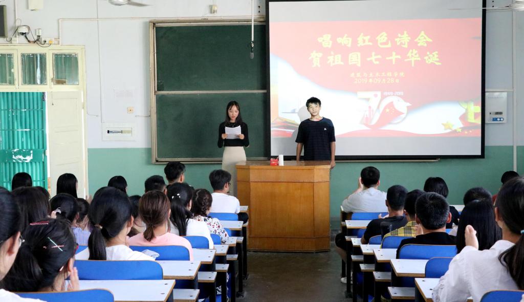 为进一步弘扬爱国主义精神,引领新青年唱响新旋律,在新中国成立70周年之际,yl23411永利集团官网于9月29日晚在综合实验楼405教师开展了“唱响红色主旋律,庆祝祖国70华诞”主题诗会活动。学院党委副书记方明科、团委书记张晓博、学生党员代表等70余人参加了本次活动。