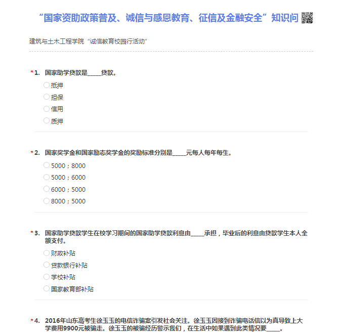 6月13日-6月14日,永利集团官网利用网络,开展了“国家资助政策普及、诚信与感恩教育、征信及金融安全”知识问卷,设计单选题20道,多选题10道,简答题1道,参与网络答题的学生有519人,达到学院在校生人数的97%,学生参与率高。