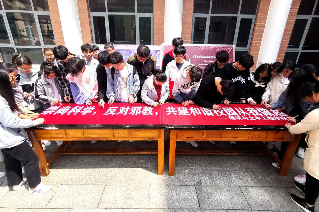 4月15日下午,学院在综合实验楼广场组织开展反邪教警示教育主题活动。活动上,同学们首先观看了《失陷的乐园》等主题教育短片,通过学习视频资料,同学们进一步认清了邪教的本质,从根本上、源头上预防了邪教的滋生,营造了和谐稳定的校园环境。接着,同学们来到综合实验楼小广场,在《反邪教警示教育进校园》主题展板前,学院团委书记张晓博为同学们讲解了大学生受邪教侵害案例,这些案例深深触动了同学们的内心,让他们从更深层次上了解到邪教组织对我们身心健康造成的伤害与影响,帮助他们提升了明辨是非的能力;了解了“法轮功”、“全能神”等邪教组织的本质与骗人的伎俩,树立起自觉抵制邪教渗透的防范意识。最后,同学们在“崇尚科学,反对邪教,共建和谐校园从我做起。”条幅上签下了自己的名字,坚定了做有理想、有信念的新时代大学生,努力把自己锻炼成为社会主义事业的建设者和接班人。(yl23411永利集团官网 陈瑜苹)