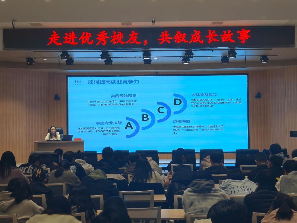 接着,她从施工、建设、设计、检测、咨询、专业设备和材料、新能源、新基建、海外发展等九个方面向学弟学妹们介绍了土木工程专业大学生的职业发展路径和就业去向,重点围绕就业心理、职业竞争提高力、创业精神与创新意识培养等内容进行了详细阐述。王新娣最后指出,未来几年,随着国家基础设施建设的繁荣和房地产市场的回暖,土木工程行业将更加注重绿色建筑、智能建筑等方面的发展,对专业人才的需求也将持续增加。同学们一要保持自信,做到顺势而为。二要持续学习,不断升级认知。不仅要在专业上精益求精,更要在管理、沟通和人际交往等方面多学习。三要夯实技能,持续提升就业竞争力。要在专业技能提升、资质证书考取、实践经验积累、人际关系建立等方面多下功夫,着力提升综合素质,努力成为高素质复合型专业技能人才。