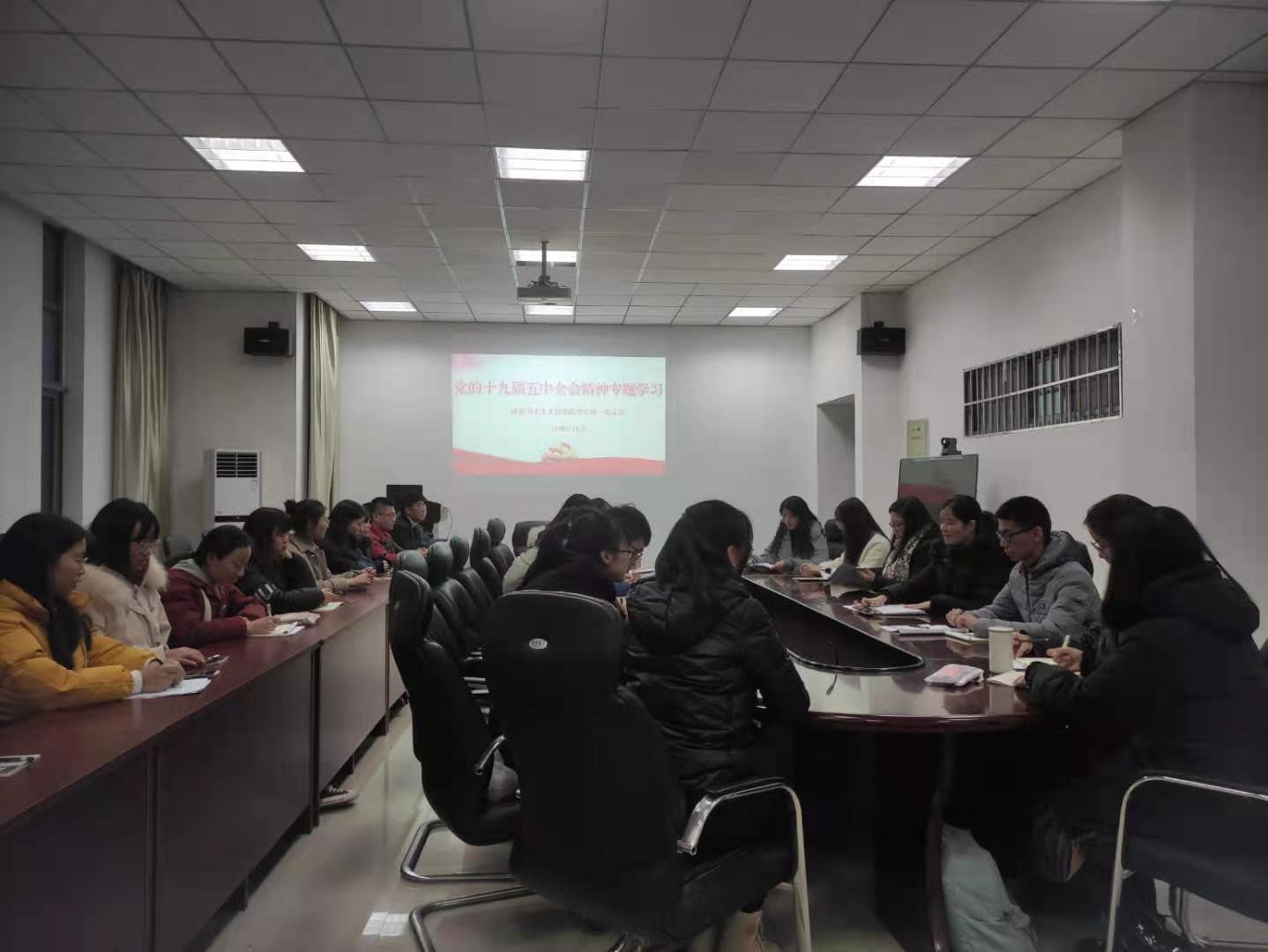 11月10日下午,学院召开教职工政治理论学习会议,专题学习党的十九届五中全会精神。会上,学院党委书记黄学玉重点从党的十九届五中全会的基本概况、主要内容、新征程新理念等方面解读了全会精神。他强调,作为高校教师,我们要始终牢记立德树人的根本使命,永葆培育英才、教育报国的初心,以党的十九届五中全会精神为指引,努力为培养担当民族复兴大任的时代新人贡献力量。