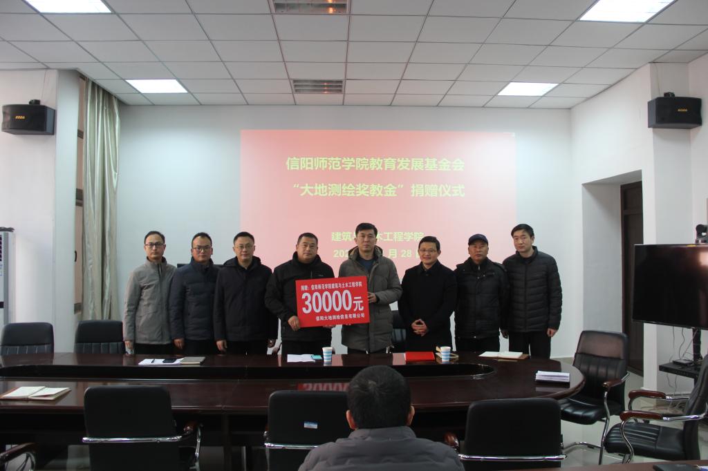 12月28日,信阳师范学院“大地测绘奖教金”捐赠仪式在永利集团官网yl23411永利集团官网206会议室举行。信阳大地测绘信息有限公司总经理汪波,校对外联络处办公室副主任齐东伟,yl23411永利集团官网领导班子和全体教工参加仪式。仪式由yl23411永利集团官网党委书记方明科主持。