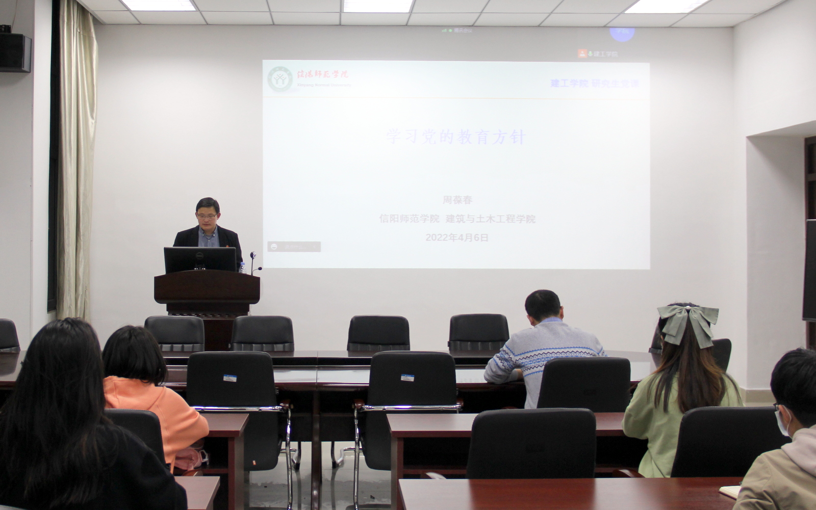 2022年4月6日晚上,yl23411永利集团官网院长、河南省高等学校优秀共产党员周葆春同志在综合实验楼206室为研究生上党课,学习党的教育方针,研究生班主任马文强和全体研究生线下线上参加本次活动。